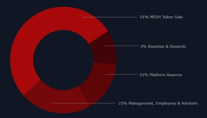 Hardcap : 18 Milyon DollarsMESH Tokenwill be distributed to the platform users who prefer to sell data to the companies, will contribute to the chain of distributed storage blocks through the hosting profiles and act as a witness to verify MESH transactions in the platform block chain. 51% of the total token source will be issued to the user first. The architecture of the MESH smart contract is designed to reduce the transaction costs the least, but the application of the smart contract still requires gas. Individual buyers can buy MESH (20,000 MESH) at an ETH value of 20. Users who buy MESH directly from the platform will have the ability to exchange coins to access the data that users can choose to sell for MESH. Once the initial tokens are deployed, the new MESH tokens will only be used for networking, blockchain profile validation, and so on.
