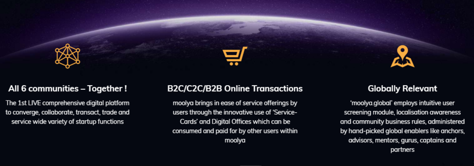 The introduction of moolyacoin aims to promote the cause of moolya.global - the world's first digital start-up ecosystem, promoting the adoption of a common transactional currency allowing users of the global community to access the various services of the platform 'moolya.global.
